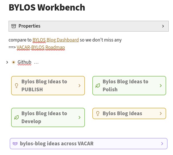 BYLOS is the website describing the instantiation of an environment to aid integrating my values with my actions - my Life Operating System. My LOS has developed incrementally over the last couple of years and is currently called VACAR and implemented in Obsidian.md . BYLOS is a work-in-progress describing VACAR , discussing the concepts, the tool Obsidian and provides an example of the pairing.