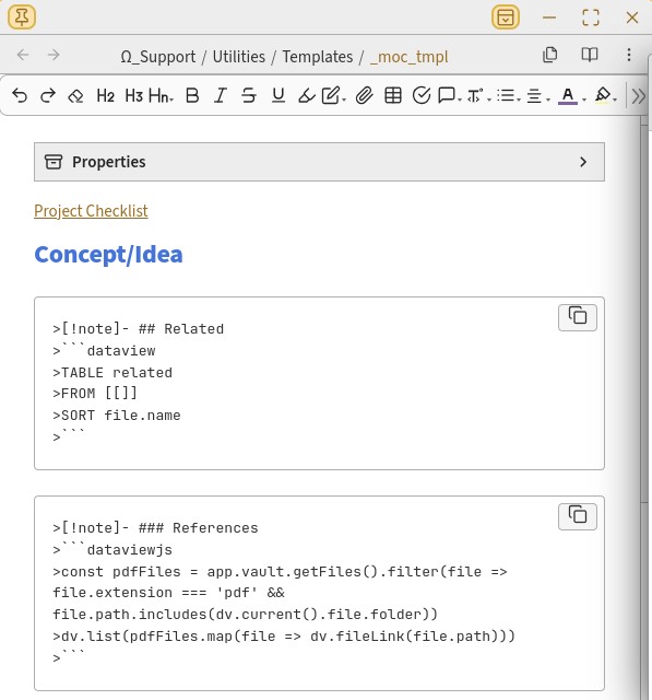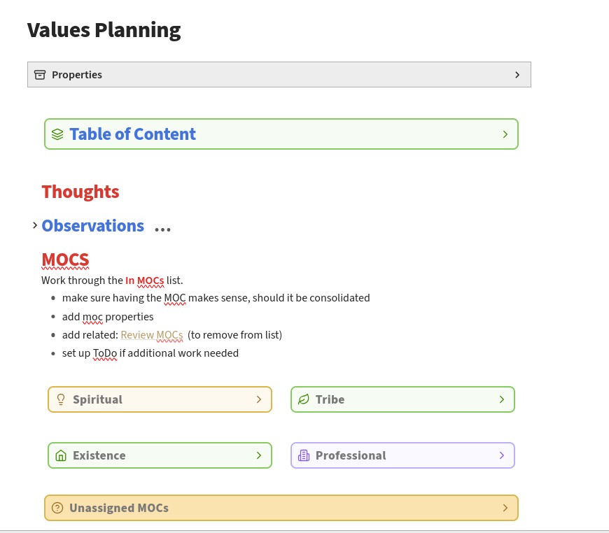 I am also working on corralling my MOCs into supporting my Values, so I can use references to the MOCs in my Daily Note log so I will eventually be able to assess how often I am focused on building out each of my Value areas.
