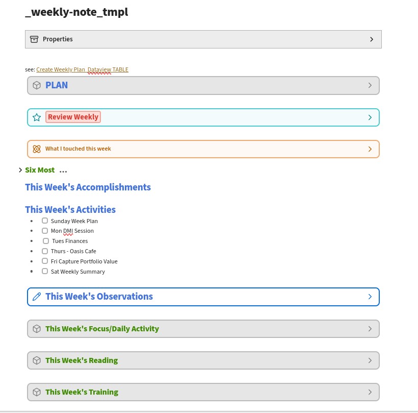 - weekly-note_tmpl: I use this for planning and summarizing my week. “Six Most” was a method for prioritizing which is being superseded by the my value driven planning.