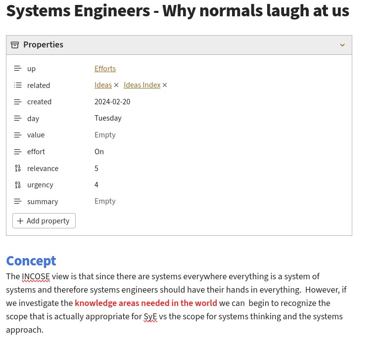 I’ve finally realized that I am not wanting for ideas, but a way to prioritize the ones I have. For much of my life, I have had natural forcing functions to rely on to keep moving, but in retirement I vacillate between having tons to do but not really having to do enough to actually fill my time. This makes me feel slothfui. I instituted a “what I touched today” dataview in my daily note, so I know I do stuff. Now I have to find a way to keep moving forward. That will take a review of my values and a way of applying them. As I am committed to these short blog posts, you’ll get to see what the first 13 days are like.